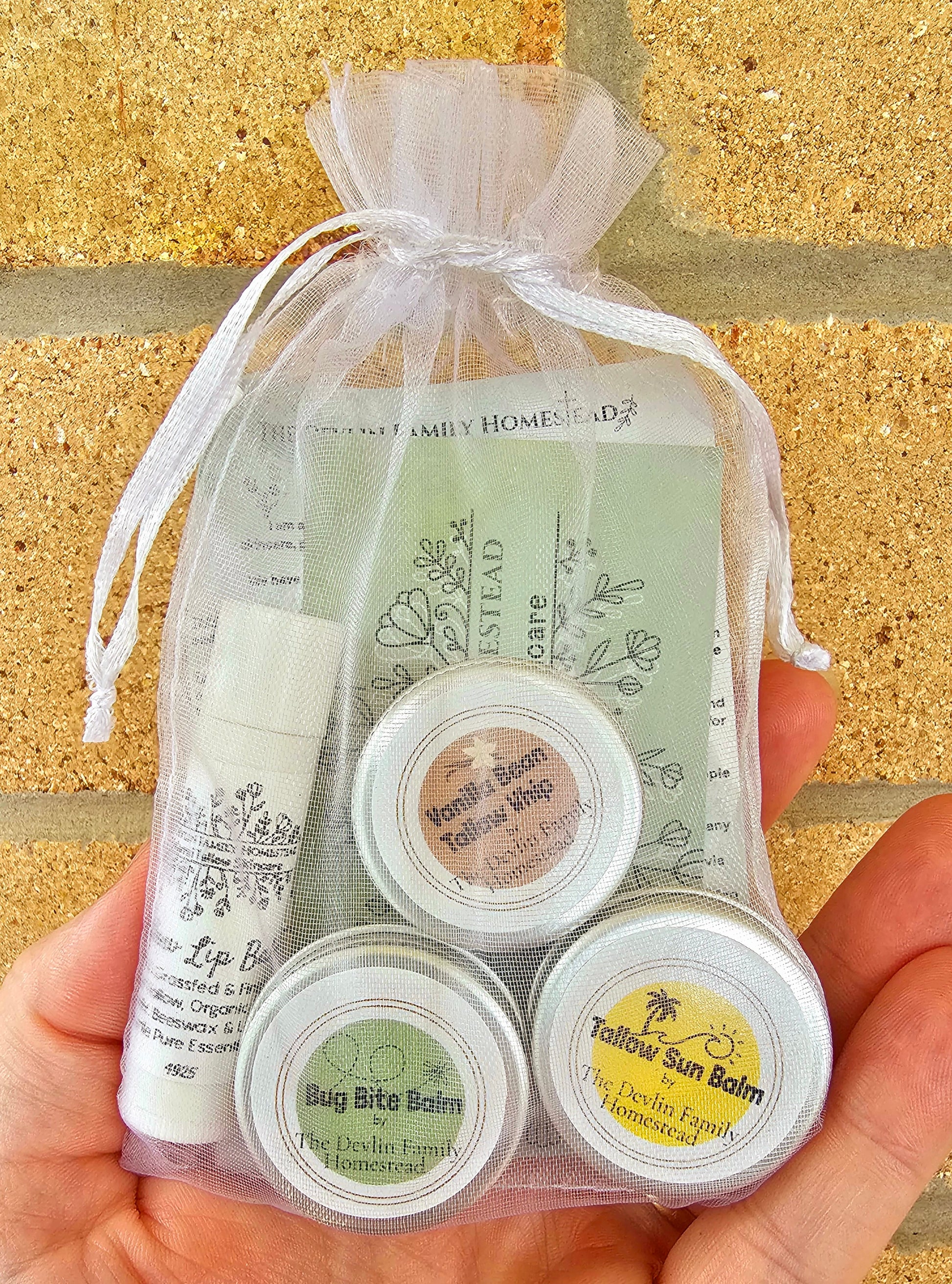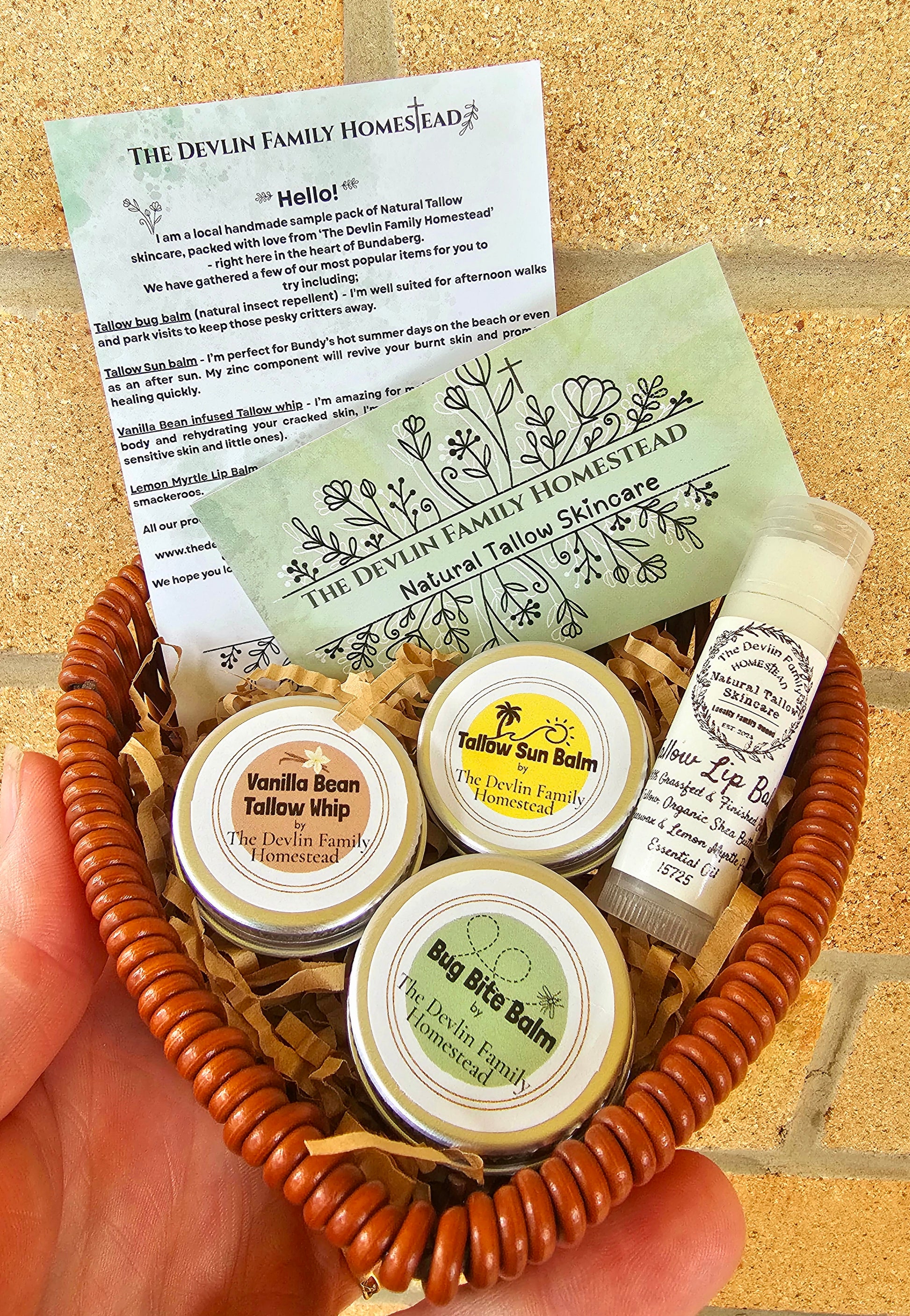 I am a local handmade sample pack of Natural Tallow skincare, packed with love from ‘The Devlin Family Homestead’